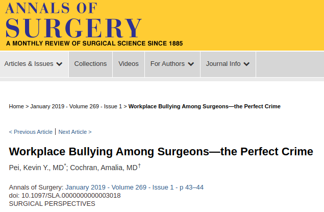 Pei, Kevin and Cochran, Amalia. Workplace Bullying Among Surgeons – the Perfect Crime. Ann Surg 2019;269:43-44. (Some excerpt phrases: “… senior leadership positions… systemic abuse of power… aggressive behavior or intentional harm doing… abusive conduct akin to psychological violence… threatening, humiliating, intimidating… other specialties are afraid of us and we are afraid of our leaders… unspoken code of silence… fear of retaliation… hiding behind the veil of patient care… perfect crime… strategic isolation of the victim….”