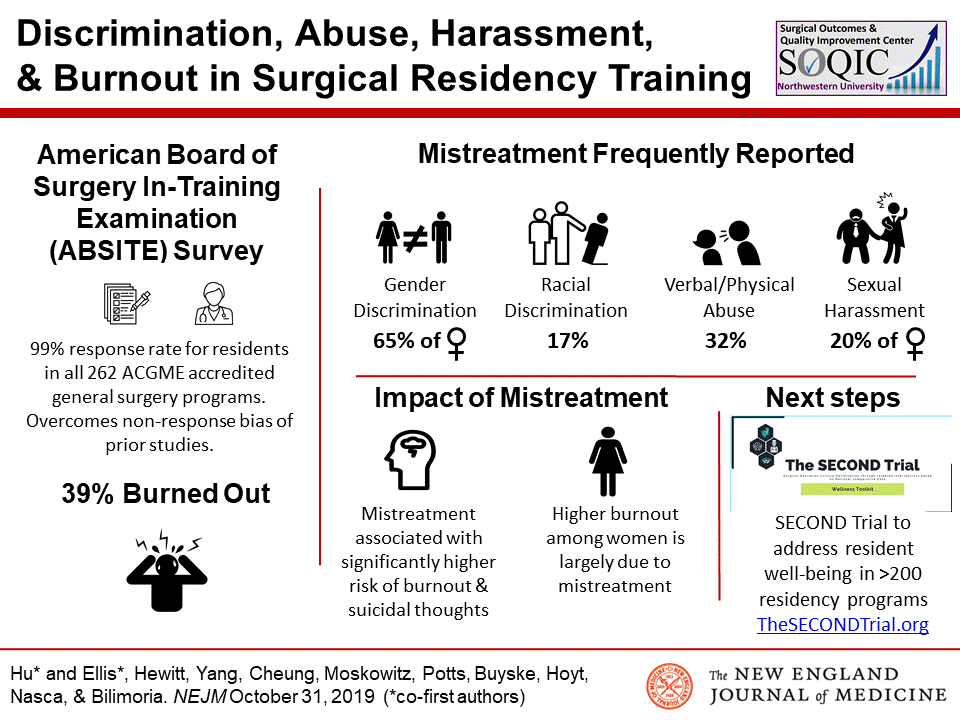 The SECOND Trial: Surgical Education Culture Optimization through targeted interventions based on National comparative Data (SECOND) Trial. Based on findings of the NEJM survey. “Physicians, particularly trainees and those in surgical subspecialties, are at risk for burnout. Mistreatment (i.e., discrimination, verbal or physical abuse, and sexual harassment) may contribute to burnout and suicidal thoughts. …occurs frequently among general surgery residents, especially women….”