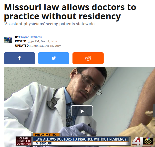 Excerpt: “Missouri’s Assistant Physician law, the first in the nation, allows medical school graduates who have passed the prescribed medical examinations and who have not entered into postgraduate residency training to serve as Assistant Physicians. The law took effect August 28, 2014, and rules were promulgated in early 2017.”